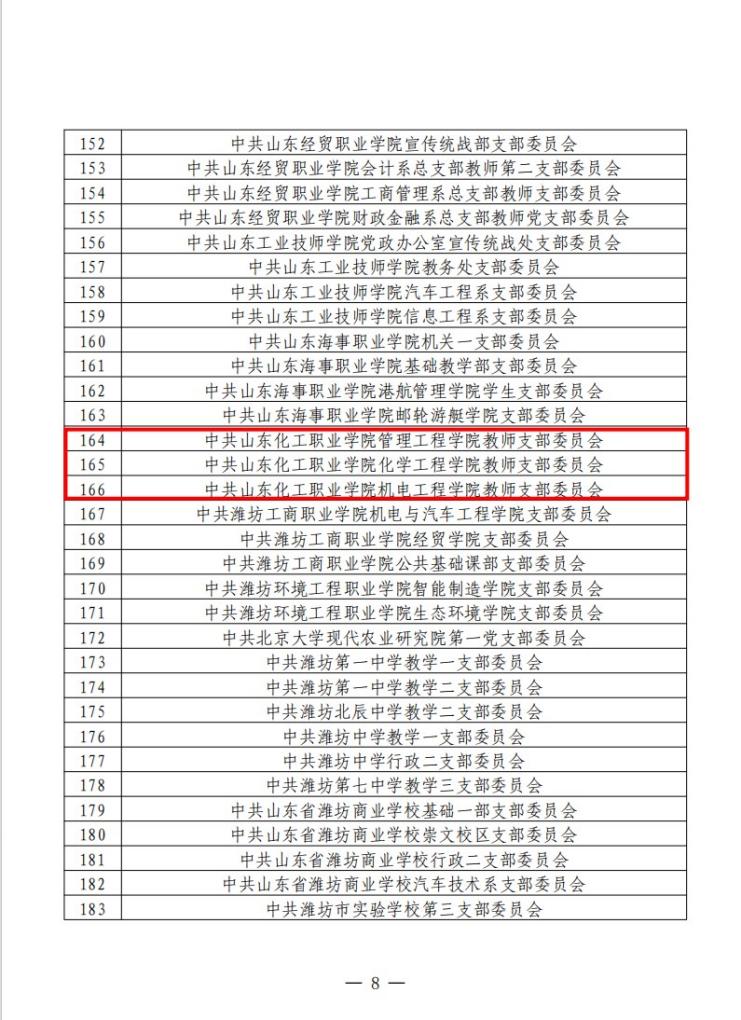 近日,在中共潍坊市委教育工委印发的《关于命名五星级“先锋”党支部的通报》(〔2024〕3号)中,中共山东化工职业学院管理工程学院教师支部委员会、化学工程学院教师支部委员会、机电工程学院教师支部委员会被命名为2023年度五星级“先锋”党支部。