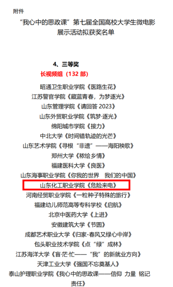 2月5日,由教育部高校思政课教学指导委员会主办的“我心中的思政课”第七届全国高校大学生微电影展示活动评选结果揭晓。本次活动共入围作品132部,由我校报送的微电影作品《危险来电》荣获长视频组全国三等奖。