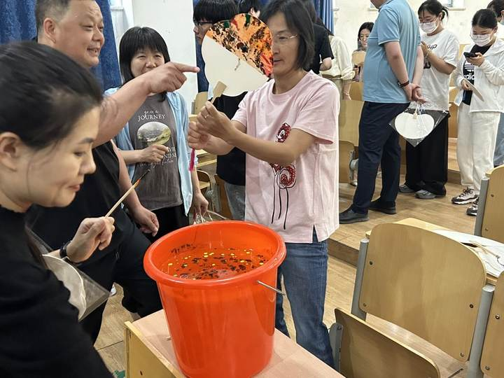 在社团小老师的指导下,教职工们全身心投入,有的细致地在扇面上勾勒图案,有的则大胆挥洒色彩,创作出一幅幅既有传统韵味又不失个人风格的漆扇作品。活动过程中,参与者不仅相互交流漆艺技巧,还分享了各自对端午节的回忆与情感,使得整个空间洋溢着温馨与欢乐。