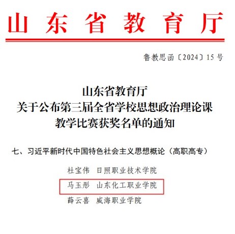 近日,省教育厅公示了第三届全省学校思想政治理论课教学比赛拟获奖人员名单,我校马克思主义学院马玉彤老师获得习近平新时代中国特色社会主义思想概论课程一等奖。