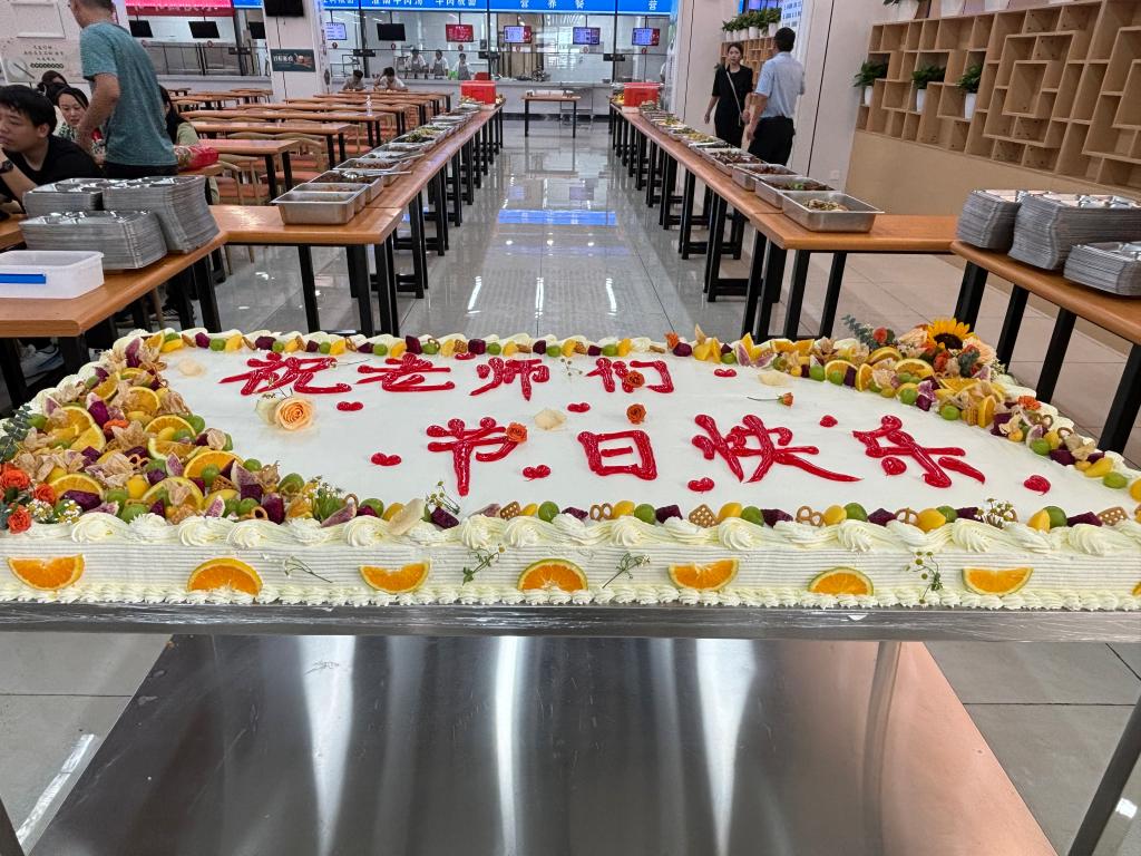教师节当天,餐厅专门布置了彩虹拱门,悬挂了热烈庆祝教师节的横幅,整个餐厅洋溢着节日的喜庆氛围。餐厅工作人员早早就忙碌起来,他们准备了丰盛的午餐、提供了免费的饮料、精心设计了庆祝蛋糕,力求将每一份心意都融入到美食之中。活动现场,学校校长贺志强、校长助理李凤娟共同为老师们切分蛋糕,一同庆祝教师节。教师们围坐一堂,品尝着美食和蛋糕,这样的庆祝方式既温馨又富有意义,让人倍感温暖和鼓舞。