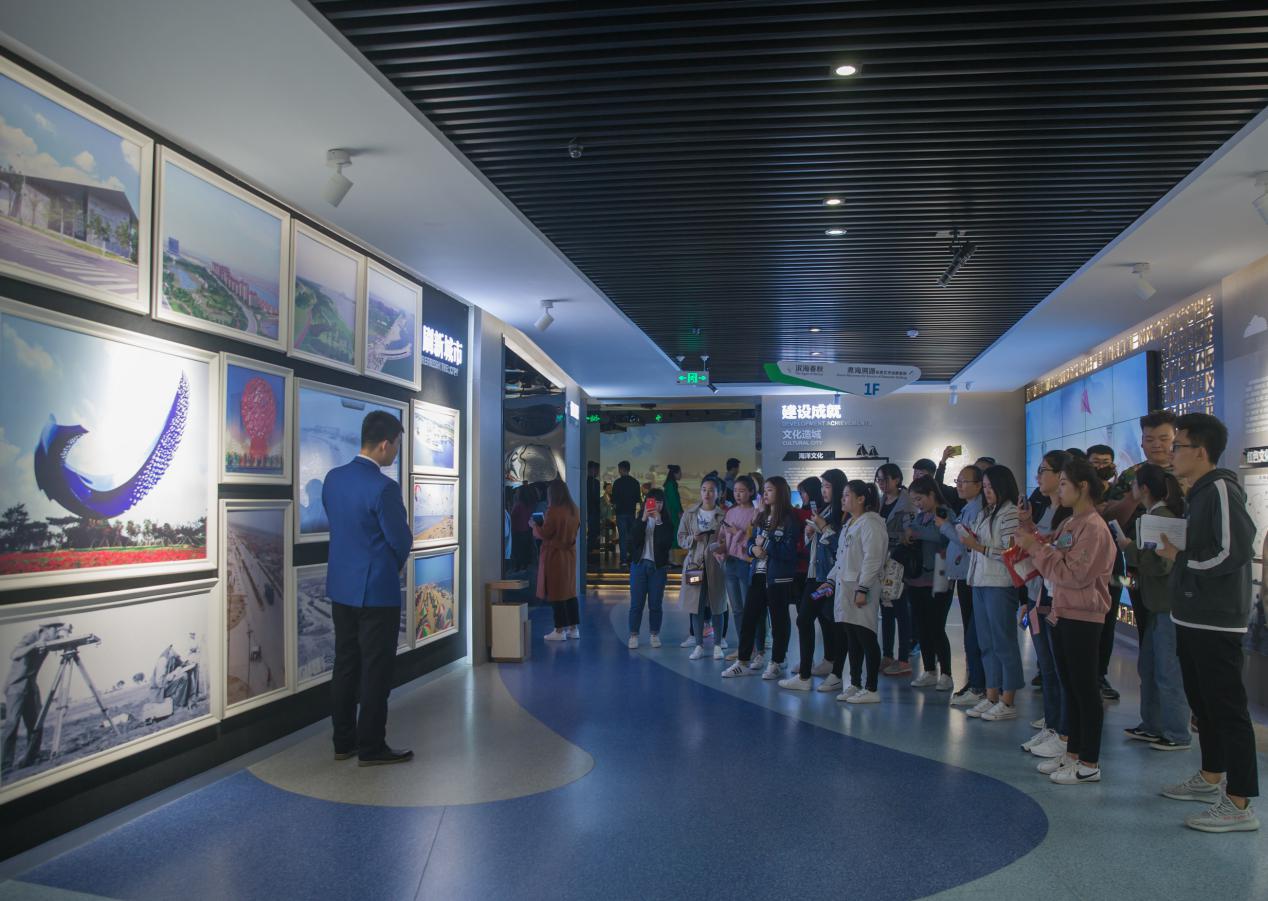 接下来到了第二站,这里主要是以潍坊滨海的城市设计、控制性详细规划以及滨海旅游集团的重点项目建设为主的空间,在这里同学们通过LED视频深深地感受到近年来城市的蓬勃发展动力与美好愿望。