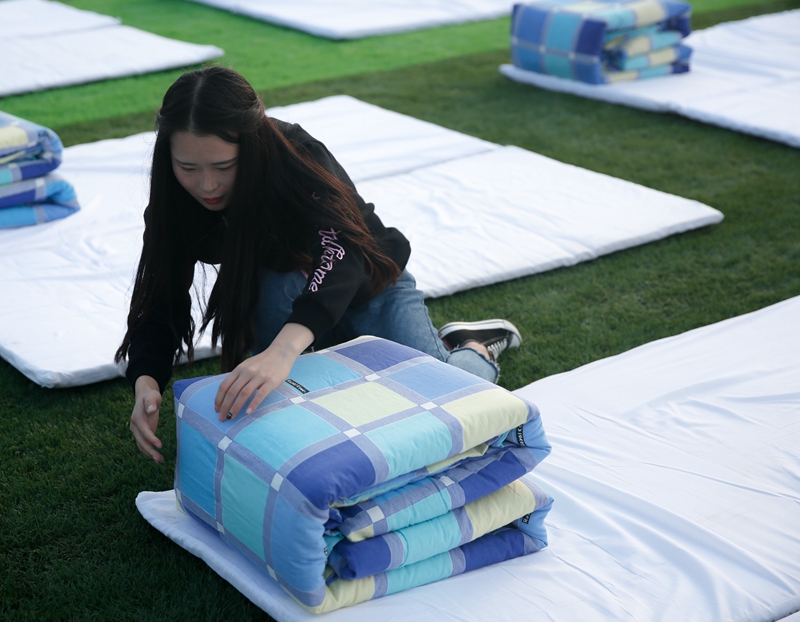 比赛开始后,自信满满的参赛选手就按照自己的节奏开始叠被子。“叠被子”看起来很普通,但是叠好了却也并不容易,需要掌握其中的诀窍以及在平时进行大量的训练。对于化院学生而言,军训时的学习、平时的锻炼还有学院坚持不懈的监督检查都是他们掌握这项技能的基础。完成比赛的同学把叠好的被子放在床垫的一角,然后静静地看着自己的队友开始新的“工程”。时间在慢慢地流逝,一个个方方正正的“豆腐块”出现在观众的眼前,像集合的战士等待着首长的检阅。