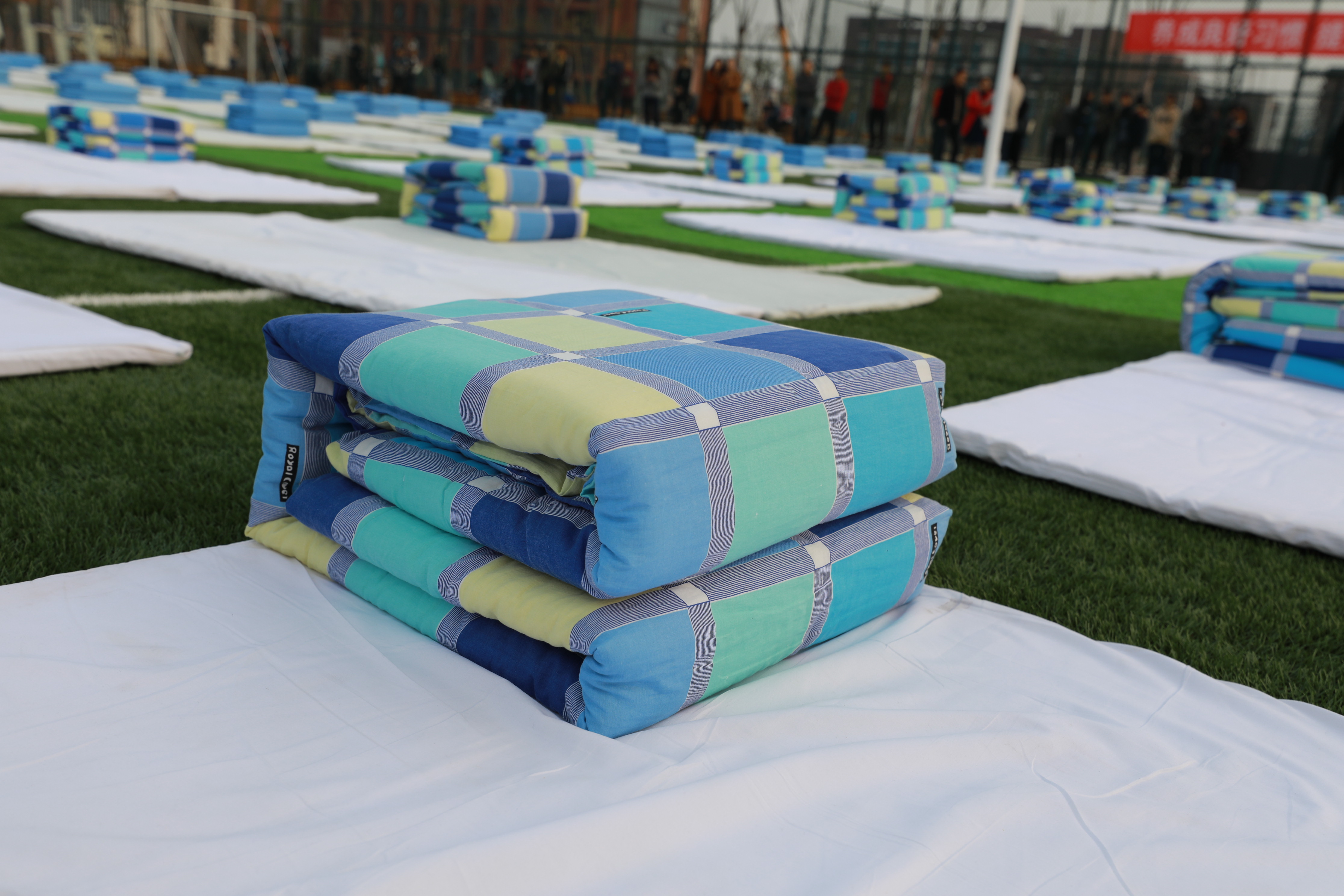仿佛是为了更好地烘托气氛,今天滨海的天气特别晴朗,鱼鳞状的白云镶嵌在湛蓝的天空中。新建的绿茵场上,一张张雪白的床垫好像绽放的花朵,参赛的同学们早早来到赛场,等待着比赛开始。