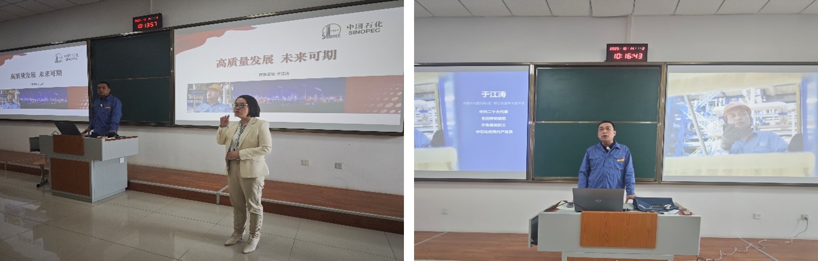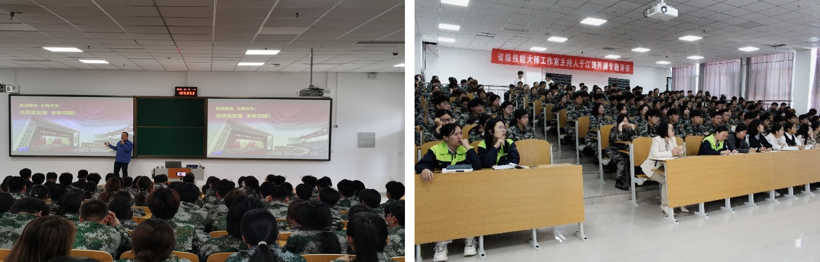 于江涛同志结合自身经历为师生作了《高质量发展 未来可期》的专题讲座。讲座伊始,他通过列举工作现场遇到的问题,介绍了炼油装置基础知识、工艺计算以及常减压蒸馏技术等知识。他以“铁人精神”—王进喜的故事,勉励同学们要有为国争光、为民族争气的爱国主义精神和胸怀全局、为国分忧的奉献精神。他以自研3D虚拟生产装置模拟系统的经历,鼓励同学们成为一个有专业领先的理论知识、有担当一面的操作技能、有敢为人先的创新理念的人。他表示“只要功夫深,铁杵磨成针”,在工作中要能吃苦、敢吃苦、愿吃苦,争做能工巧匠的传承者。于江涛用他的实际行动诠释了“以匠心守初心,以平凡铸不凡”的深刻哲理。同学们表示,作为在石化行业奋斗三十载的长者,他掌心的老茧无言诉说着技艺的精深,鬓角的霜雪默默见证着岁月的沉淀,其言行无不是工匠精神最鲜活的注脚。