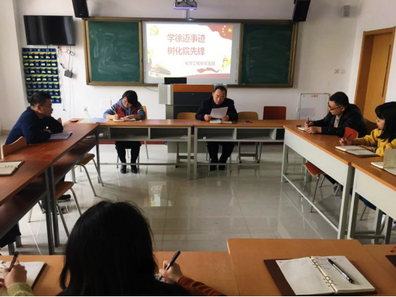 会议开始,冯喜成书记着重讲述了徐迈同志的先进事迹,号召全体党员教师要深刻学习徐迈同志“视档案如生命”“责任重于泰山”的精神。冯主任强调,党员教师不仅要学习徐迈同志忠诚担当、敢于负责的政治品格,还要学习他恪尽职守、任劳任怨的实干精神,更要学习他艰苦朴素、清正廉洁的道德情操。全体党员要始终牢记共产党人的初心和使命,立足本职,真抓实干,以徐迈同志为榜样,知行合一,严于律己,传承忠诚尽责担当的崇高品质,通过大家的共同努力将化学工程系的建设和各项工作提高到一个新的水平。全体党员教师就如何向徐迈同志学习、怎样用实际行动践行新时代共产党人应有的拼搏担当奉献精神等问题展开了热烈讨论。