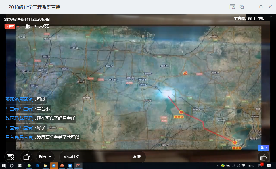 由于疫情防控特殊时期,我院的开学时间还不确定,为了不影响2018级学生的实习,为学生创造更多的实习和就业机会,减轻学生的焦躁情绪,在系领导积极联系和各位辅导员的精心组织下,4月15日下午,化学工程系通过网络平台举办了首期企业网上宣讲暨面试招聘会,2018级全体师生在线参加了本次宣讲会。