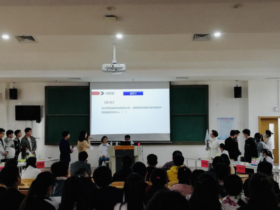 每场比赛共设计100道客观题,其中理论必答题每组6道,每名队名必答2道;抢答题分为判断题、单项选择题和多项选择题。在计时器开始计时后,各小组分别按响抢答器,抢答成功,即可答题,答对得2分,答错或犯规均扣2分。