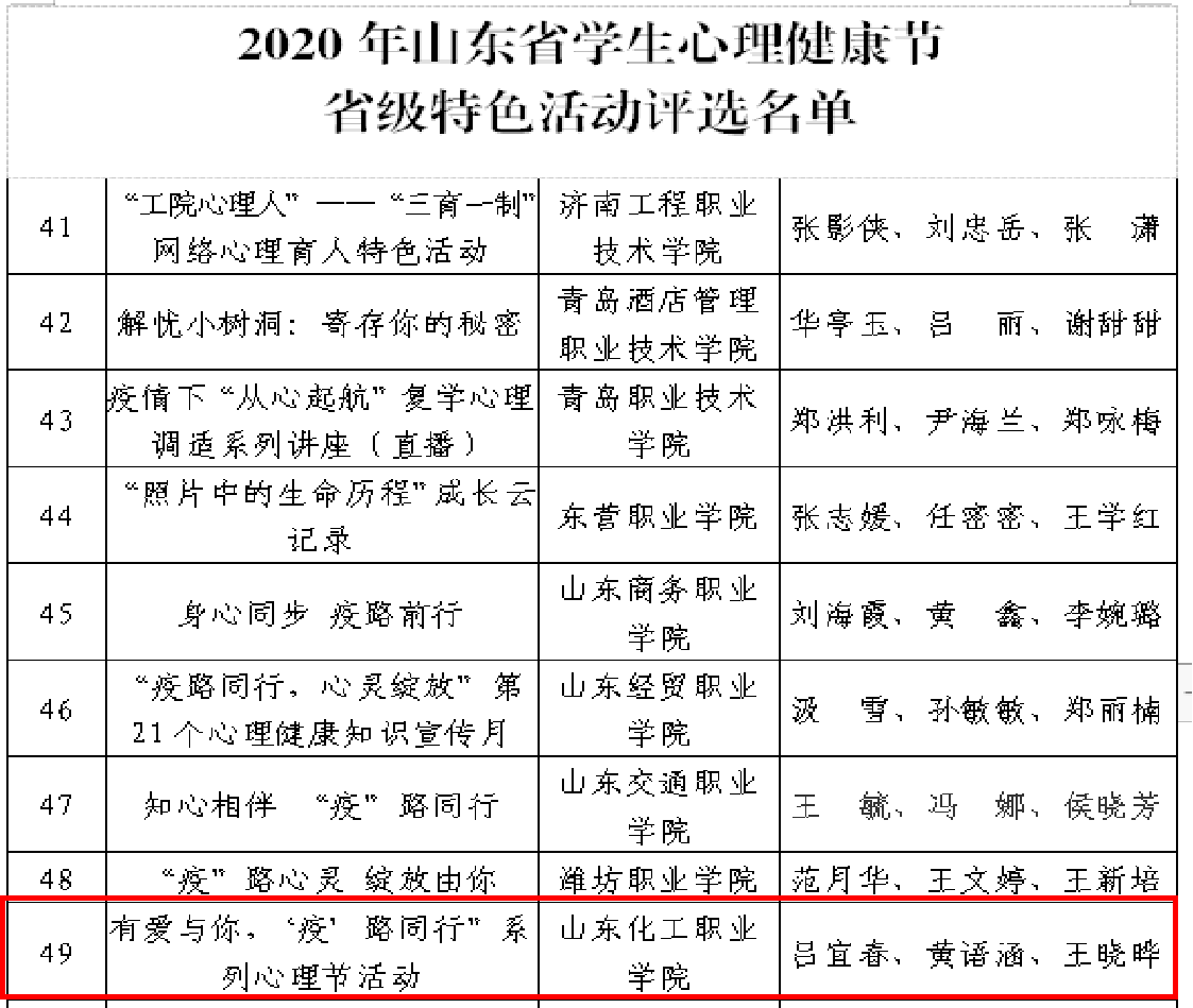 1.由吕宜春、黄语涵、王晓晔指导的“有爱与你,’疫’路同行”系列心理节活动入选省级特色活动。