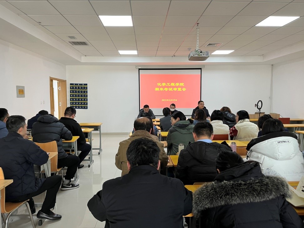 2021年12月15日,化学工程学院通过线上、线下同步的形式,在2308教师召开全体教职工大会。本次会议重点强调了期末考试布置及安排,副院长吕宜春、副书记王恒磊、副院长兼副书记葛彩霞分别发表讲话。
