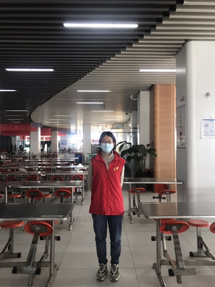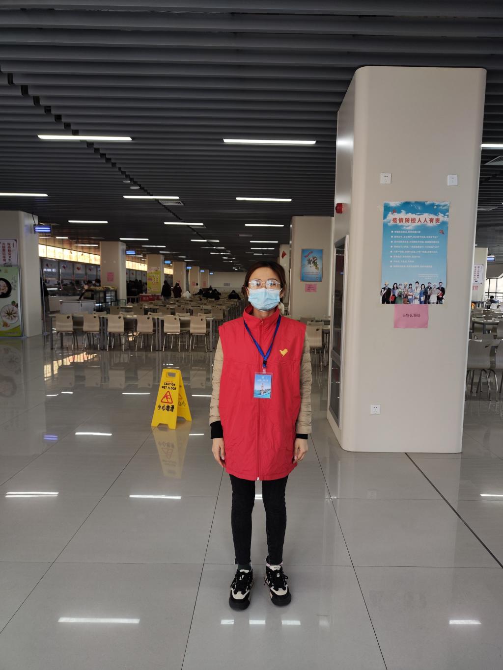就餐时间,“红马甲”各就各位来到餐厅的各个角落。有的在餐厅入口维持秩序,有的在餐厅里提醒师生就餐间隔一米距离,单方向朝南就餐,有的在提醒学生带好口罩。有的在地下负一引导师生从餐厅南门离开餐厅。