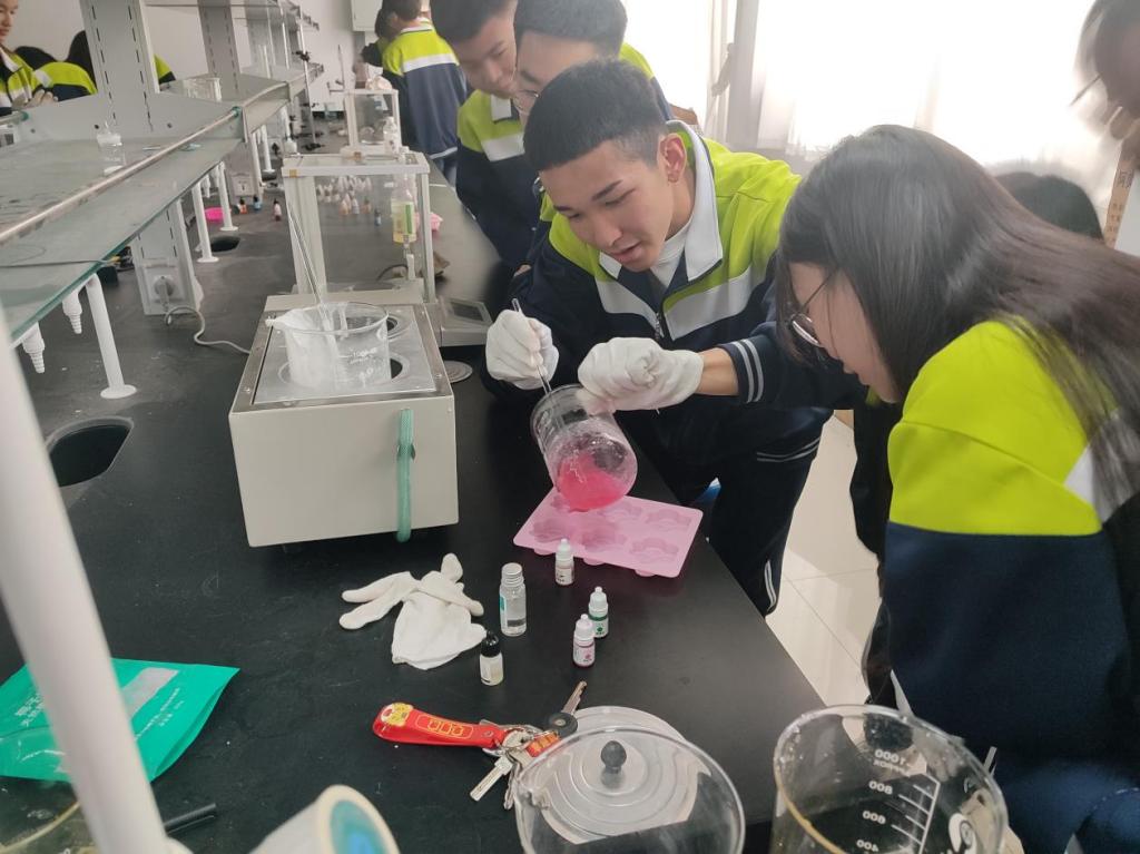 活动中,学生在专业老师和工作人员的带领下,先后体验了手工皂制作,精密天平称量,化工分析等多个体验项目。