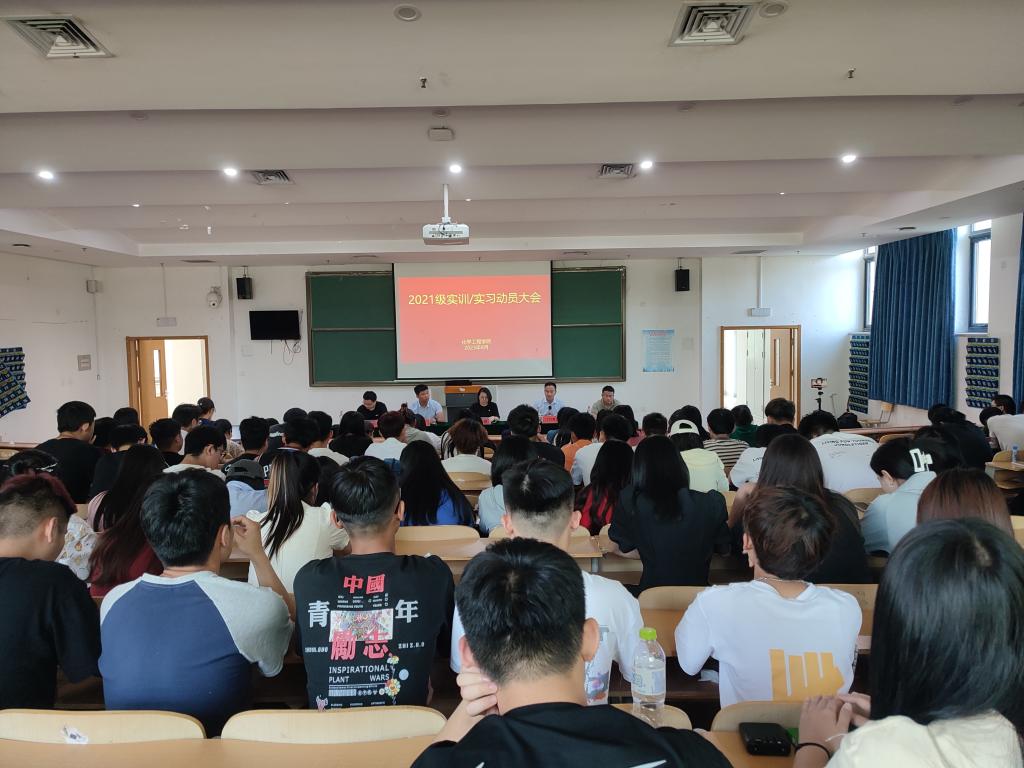 为扎实做好2021级学生实习工作,进一步促进学生对所学知识和技能进行实践运用、总结和深化,引导学生明确认识实习的目的和意义,2023年6月9日下午,化学工程学院通过线上、线下相结合方式,在阶梯1组织召开了2021级实训/实习动员大会。会议由化学工程学院实习管理张维磊老师主持,学校教务科研处副处长丁竹青、培训处副处长王超、化学工程学院党总支副书记、副院长葛彩霞、化学工程学院党总支副书记王恒磊、全体实习指导教师、辅导员及2021级全体学生参加。