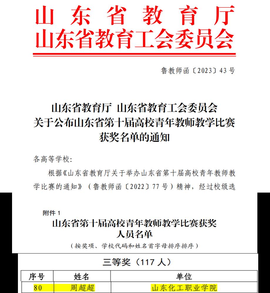 2023年7月13日,山东省教育厅发布了《关于公布山东省第十届高校青年教师教学比赛获奖名单的通知》,化学工程学院周超超教师获比赛三等奖。