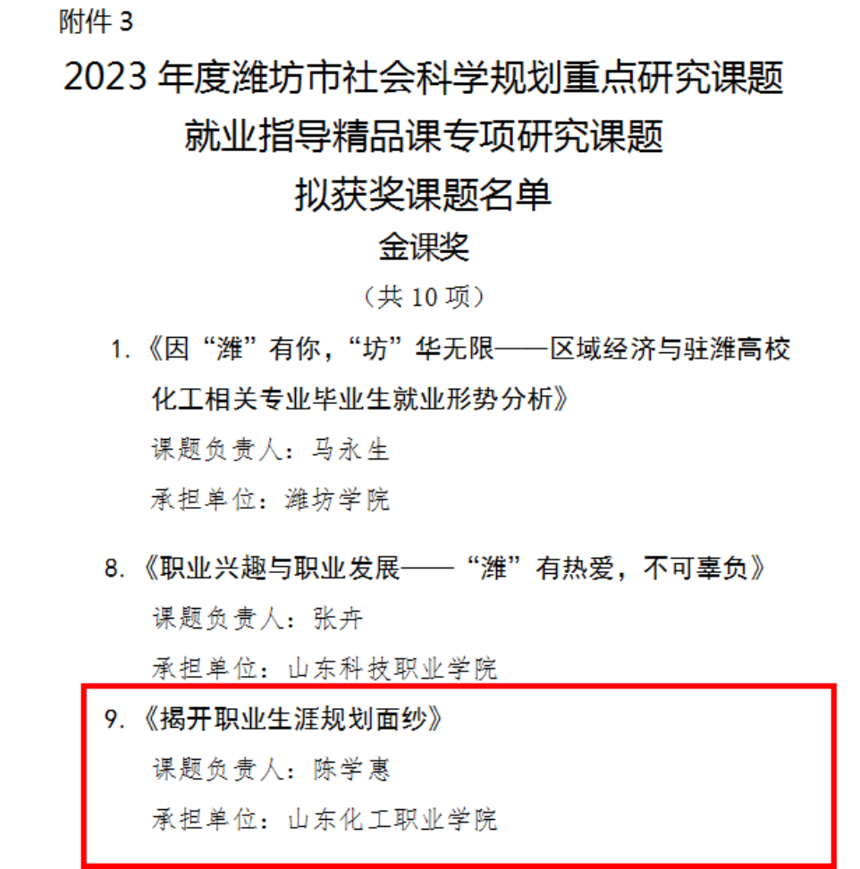 近日,由潍坊市社会科学界联合会举办的2023年度潍坊市社会科学规划重点研究课题、专项研究课题发布了拟结项名单、优秀课题和获奖课题名单公示,“就业指导精品课”专项课题共有80项通过鉴定结项,30项获奖,其中获金课奖10项,银课奖10项,优秀建设奖10项。化学工程学院陈学惠、王欣项目团队申报的《揭开职业生涯规划面纱》荣获金课奖,获奖课程同步发布在青桔创课平台。