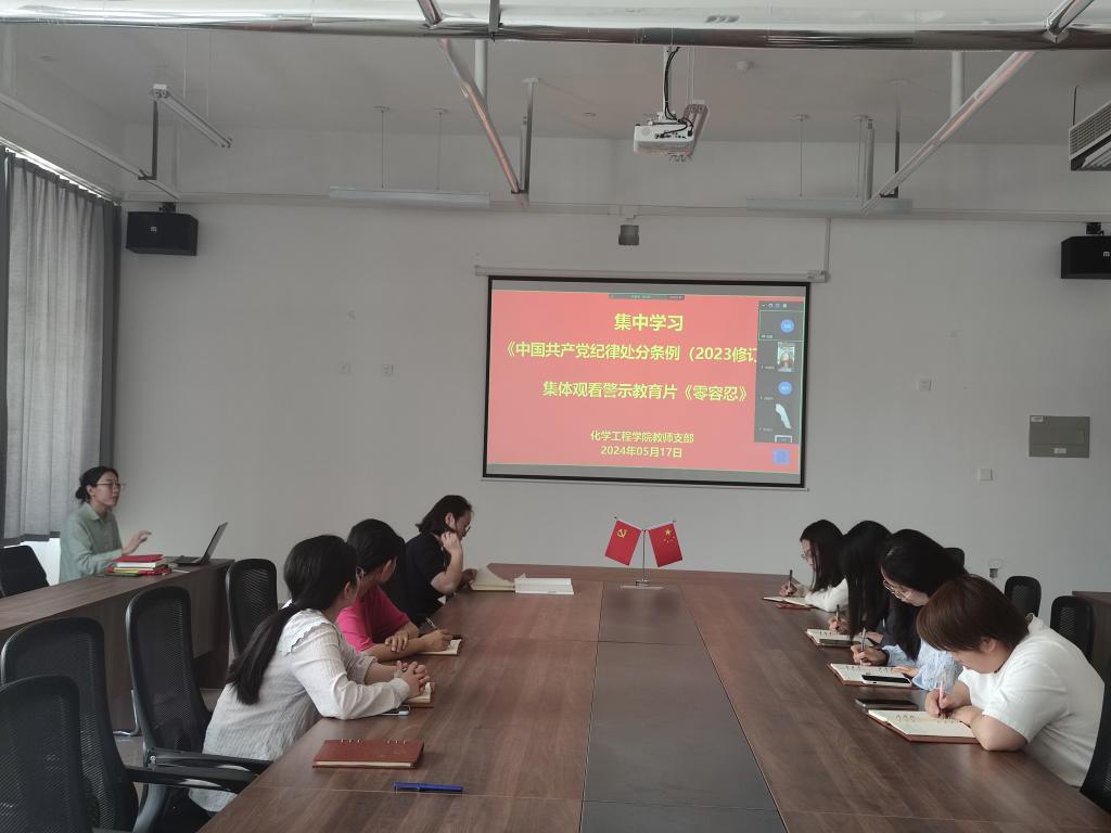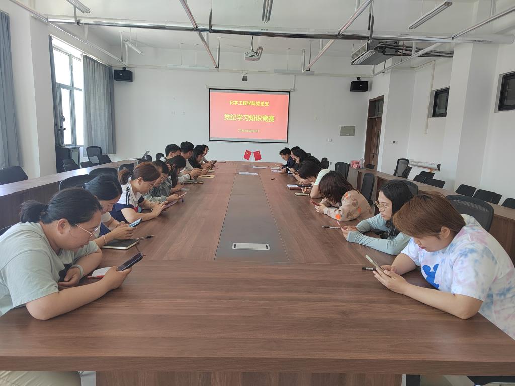 为深入学习贯彻习近平总书记关于党纪学习教育的重要讲话和重要指示批示精神,加强党的纪律建设,扎实推动党纪学习教育走深走实,以学习贯彻新修订的《条例》为契机加强纪律教育,引导广大党员教师学纪、知纪、明纪、守纪,积极营造崇廉尚洁、向上向善的社会风尚,从4月开始,化学工程学院党总支召开了党纪学习教育启动部署党员大会,正式启动了系列学习活动。5月17日,组织全体党员教师开展了《中国共产党党纪处分条例》学习专题会。全体党员教师参会,部分同志线上参会。