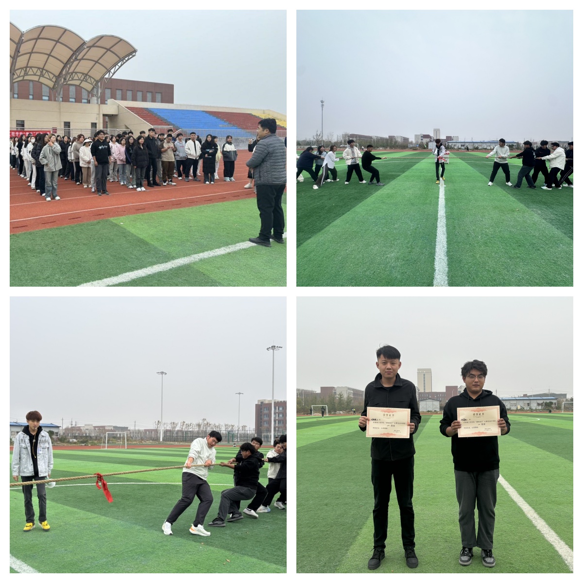 为丰富校园文化生活,增强学生团队协作能力,培养同学们的集体荣誉感,11月12日下午管理工程学院在主校区田径场开展了趣味拔河比赛决赛,六个班级六十余名学生参与到决赛中。