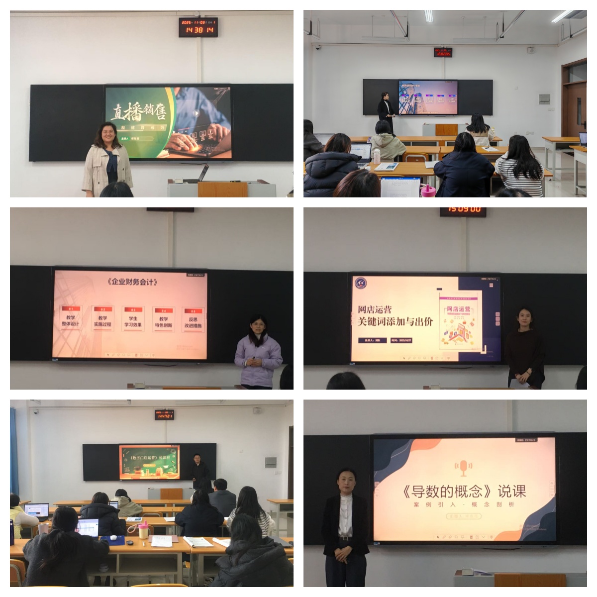 在核心环节展示中,“说专业群”环节,数字商贸专业群带头人围绕建设背景、组群逻辑、建设目标及建设措施四大维度展开系统阐述,清晰明确了专业群的整体发展方向;“说专业”环节,各专业带头人围绕专业定位、特色优势及未来发展方向展开深入剖析,为专业的精准建设与优化升级提供了清晰思路;“说课程”环节,骨干教师聚焦课程体系设计、教学内容重构等核心问题进行细致阐述,充分凸显了课程设置与产业需求的紧密对接;“说课堂”环节,青年教师们积极分享课堂教学实践经验与创新举措,充分展现出蓬勃向上的教学热情与扎实过硬的创新能力。