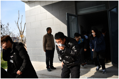 本次演练分为教学楼疏散演练和宿舍疏散演练两阶段。当天下午13时40分,随着一声哨响,教学楼疏散演练开始。同学们有的用衣袖,有的用衣角掩住口鼻,头部放低、重心下移,靠右贴着墙有序撤出教室向楼下疏散。整个过程紧张而有序,脚步声急促但不慌乱,所有人沿着预定路线快速撤离。虽然在个别楼梯拐角处发生短暂拥堵现象,但整个教学楼疏散演练过程没有发生任何事故,1200多人仅用时两分钟就完成教学区域安全撤离任务。经集合点负责人核查,师生全部集合到位。