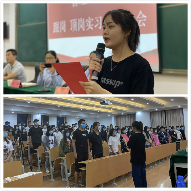 最后,由学生代表孙晓俊带领2018级全体学生进行了顶岗实习宣誓:在跟岗顶岗实习期间,防控疫情,严格自律;遵章守纪,忠于职守;爱岗敬业,刻苦学习;团结奋进,乐于奉献;不忘初心,牢记使命;爱我中华,战胜疫情;时刻维护化院形象,苦练本领,全面发展;超越自我,争创辉煌。