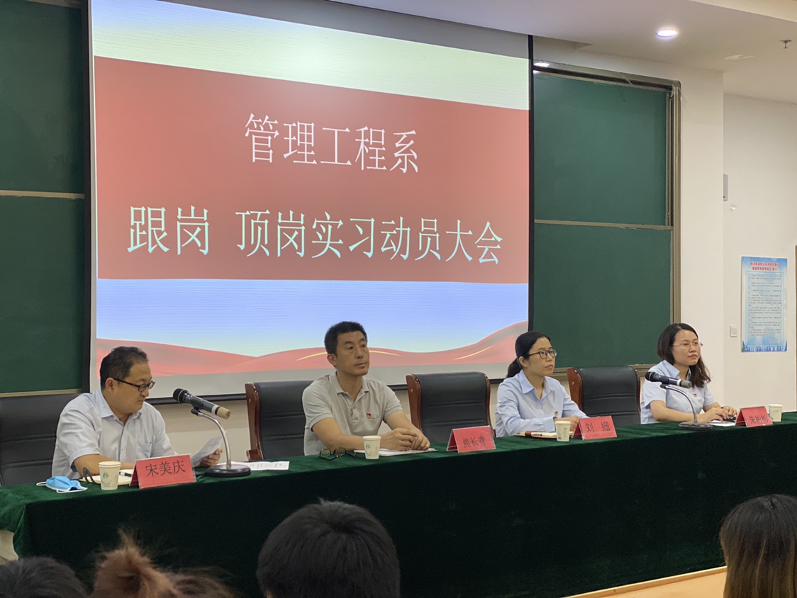 7月1日晚上,管理工程系在8号多媒体教室举行了2018级学生跟岗顶岗实习动员大会,学院教务处刘珊副处长、就业工作处焦长青老师、管理工程系朱彬彬主任、宋美庆书记、全体辅导员和2018级全体学生参加了会议,会议由管理工程系党支部书记宋美庆主持,并在线上进行了直播。
