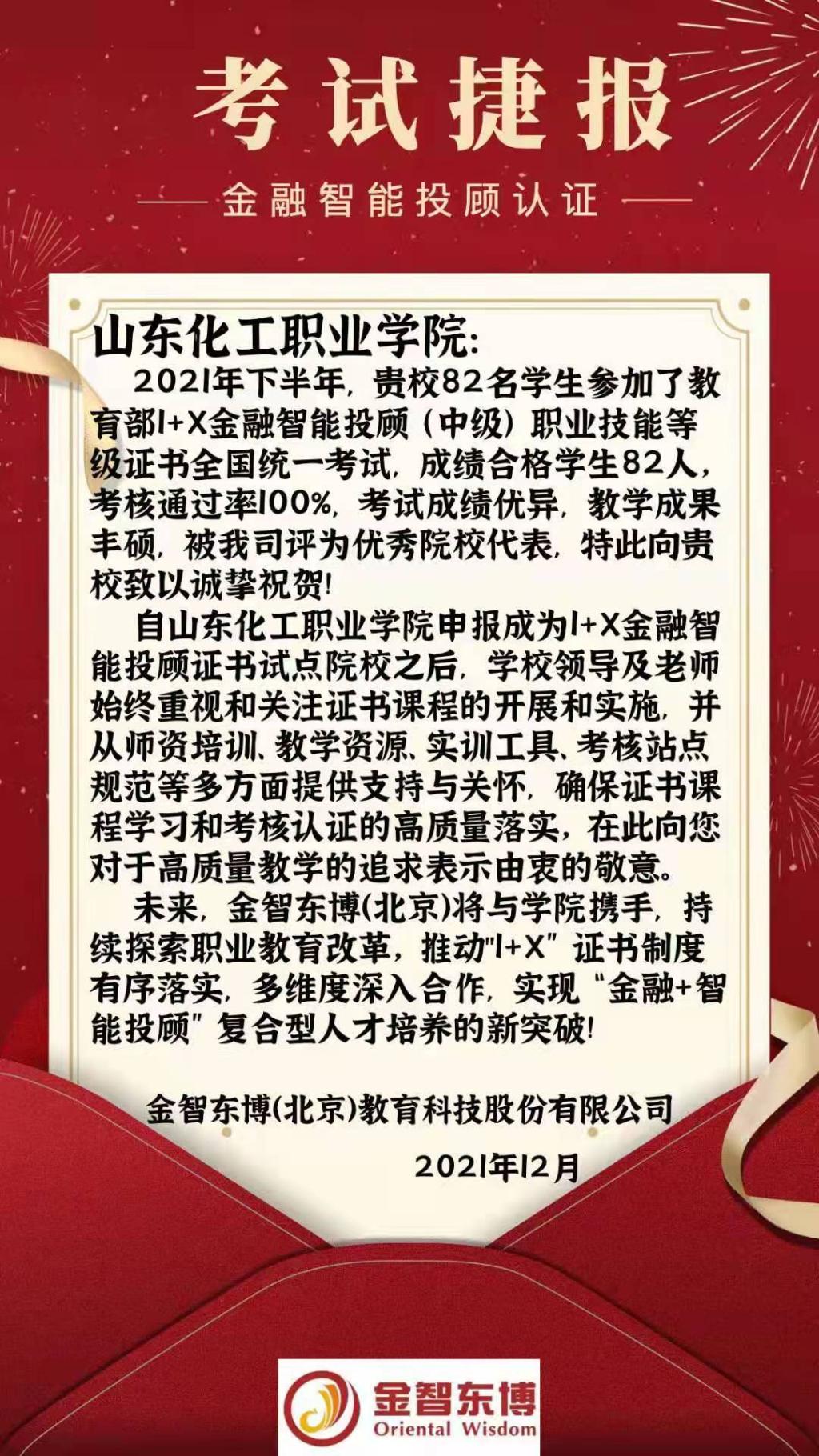 12月27日,金融智能投顾职业技能等级认证(中级)考试在我校顺利举行,本次考试由管理工程学院组织,82名学生参加了认证考试,机考均分85.3分,通过率100%,取得了我校首届“1+X”金融智能投顾职业技能等级认证的开门红,得到了主考方金智东博(北京)教育科技股份有限公司的高度认可,并为我校颁发了喜报。