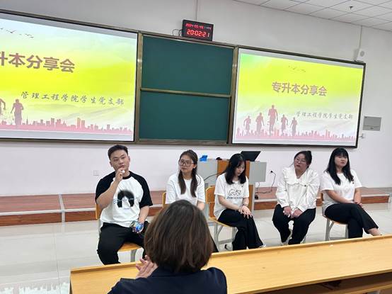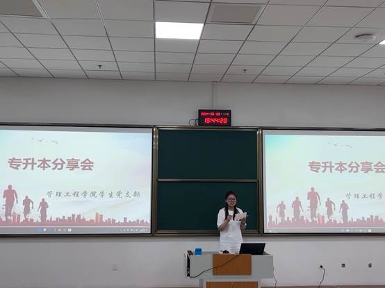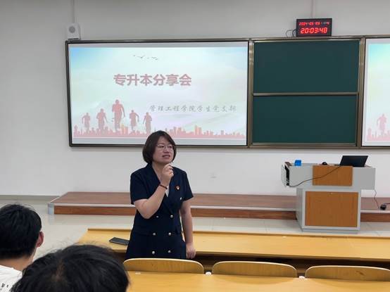 为进一步促进优良学风,帮助同学们了解专升本考试相关政策要求,分享成功经验,提升应试能力,6月6日,管理工程学院学生党支部在10号阶梯举办“朋辈引领,助力升本”专升本经验分享会。管理工程学院学生党支部书记朱怀红、团总支书记张灏强及2022级、2023级100余名学生代表参会,会议由2023级财富管理专业王乐乐主持。