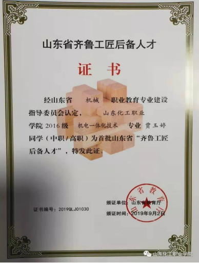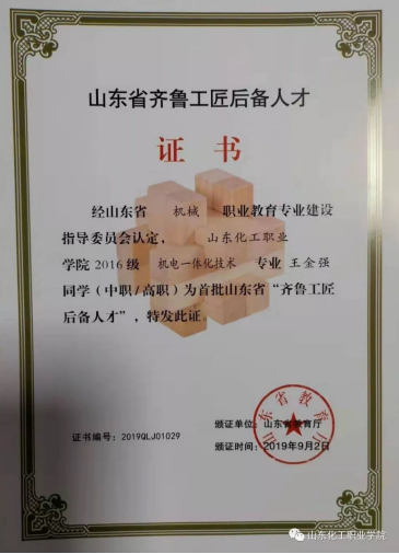 日前,山东省教育厅公布了首批“齐鲁工匠后备人才”名单,其中山东化工职业学院机电工程系2016级机电一体化技术专业的王彦山、王金强、贾玉婷,3名学生成为山东省“齐鲁工匠后备人才”。