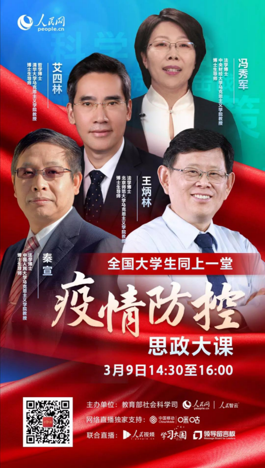 本次活动特别邀请了清华大学马克思主义学院教授艾四林、中国人民大学马克思主义学院教授秦宣、北京师范大学马克思主义学院教授王炳林、中央财经大学马克思学院教授冯秀军。结合“马克思主义基本原理概论”“毛泽东思想和中国特色社会主义理论体系概论”“中国近代史纲要”“思想道德修养与法律基础”四门必修课教学内容,解读以习近平同志为核心的党中央关于疫情防控的决策部署,分析中国抗疫彰显的中国共产党领导和中国特色社会主义制度的显著优势,讲述防疫战疫一线的感人故事,发挥高校思政课落实立德树人根本任务的关键课程作用。