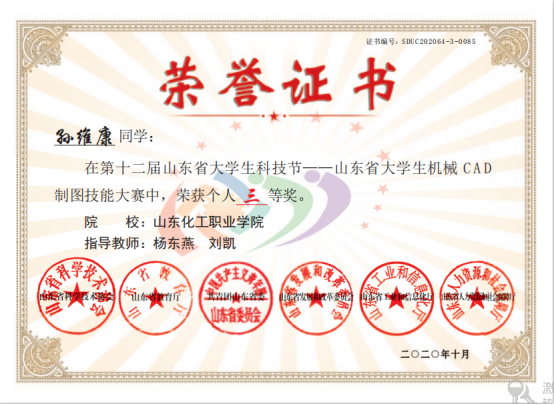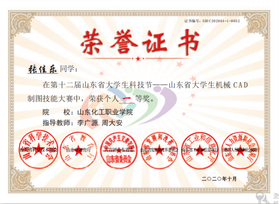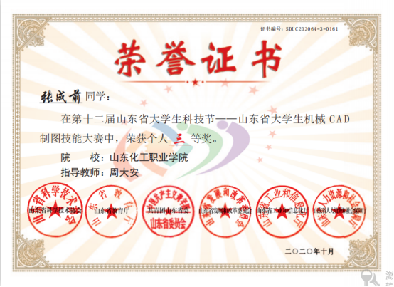 第十二届山东省大学生科技节-山东省大学生机械CAD制图技能大赛于10月24日如期举行,山东化工职业学院作为分赛场,圆满完成了比赛任务。经过激烈角逐,我院10名参赛选手(王世利、张佳乐、张振强、岳庆、付书羽、赵子龙、马有军、臧照霖、孙维康、张成前),在周大安和李广源两位指导教师的指导下,在决赛中喜获佳绩,共取得个人赛一等奖三项,二等奖四项,三等奖三项,团体赛三等奖一项,再创新高。