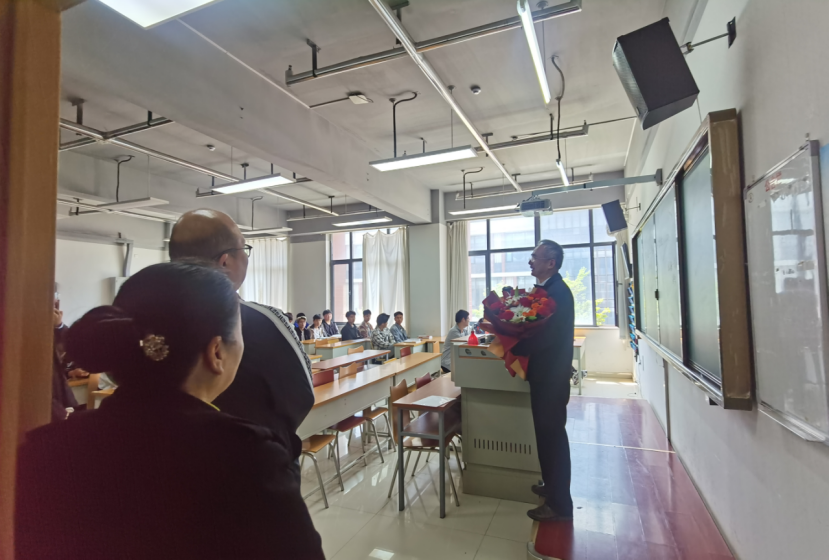 4月27日上午,三号教学楼3202教室,随着下课铃声的响起,李钦唐老师结束了教学生涯中的最后一节课,机电工程学院领导班子和教师代表走进教室,与学生一起为李钦唐老师送上了鲜花和祝福,表达了机电工程学院全体师生对李老师辛勤耕耘教坛40余年工作的感谢和依依惜别之情。