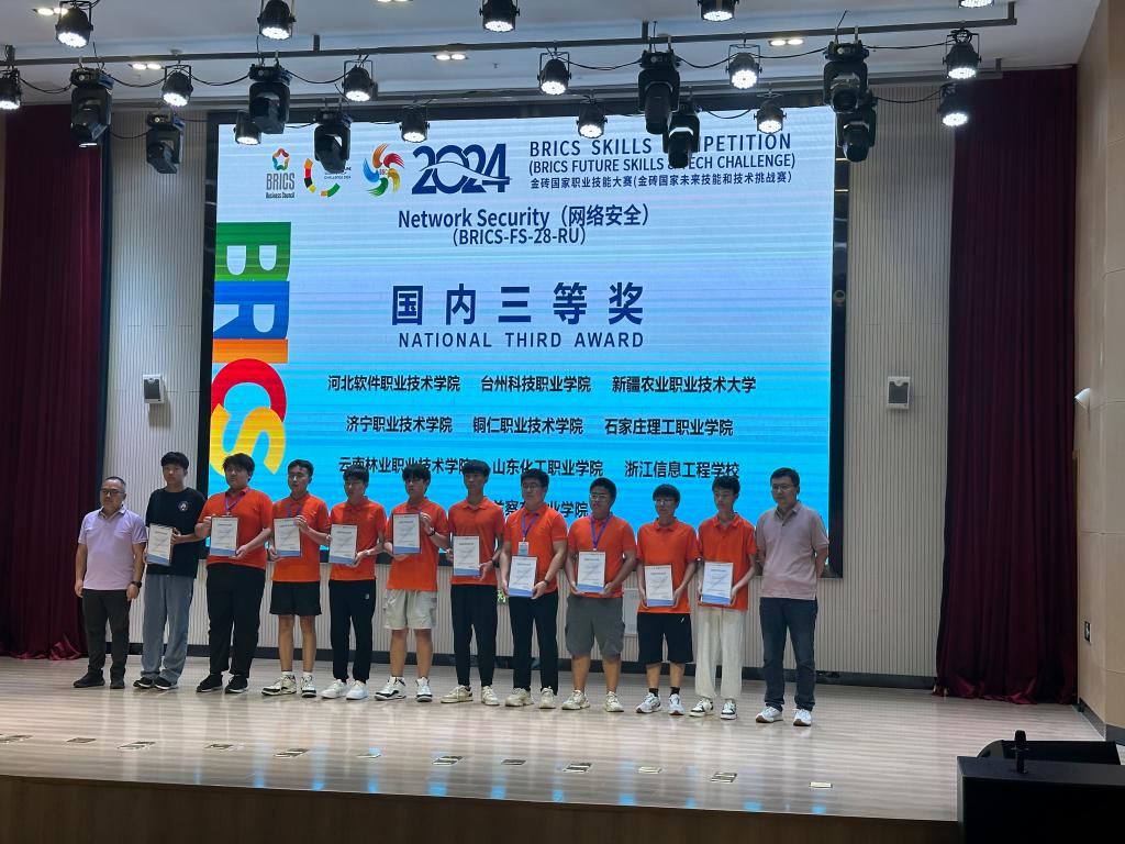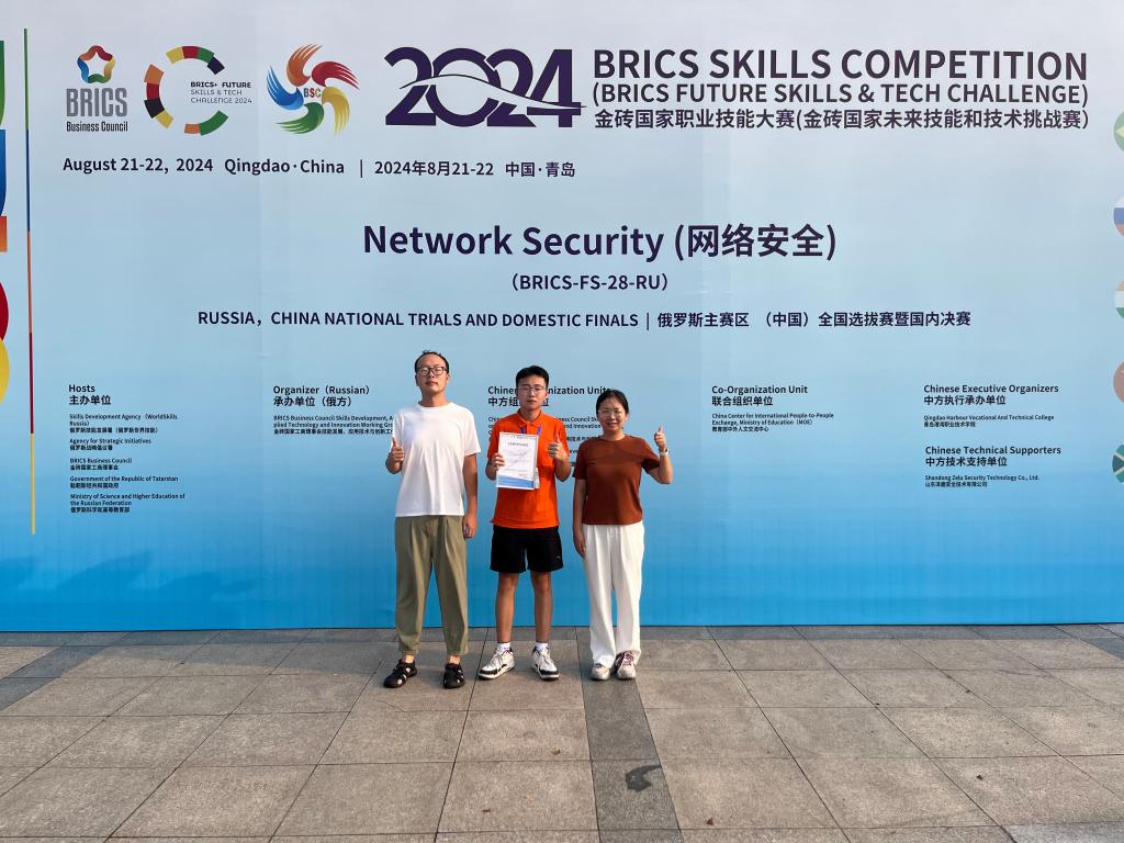 近日在山东青岛举办的2024金砖国家职业技能大赛中,经过激烈的角逐,我校信息工程学院的柴建杭同学在牛一菽、孙鹏程等老师的悉心指导下,荣获本次赛事网络安全赛项全国选拔赛暨国内决赛三等奖的好成绩。这一荣誉的取得,既是对信息工程学院在网络安全教育领域辛勤耕耘的充分肯定,亦是对其教学质量与人才培养模式的高度认可。