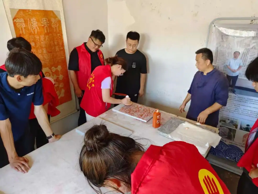 拓片是记录中华民族文化的重要载体之一。岱宗传拓创始于清晚期,是泰安市级非遗。在传习基地内,许修峰老师讲解传拓的起源与沿革、特殊特性、方法和种类、工具材料及步骤、应用、保存、历史意义与传承七个部分的内容,让学生对传拓有认识了解。随后许修峰老师亲自给学生示范如何传拓,并让学生亲自感受传拓的魅力。