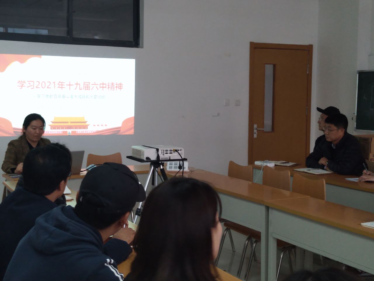 为深入学习十九届六中全会精神,11月17日下午,基础教学部党支部召开主题党日活动,吴宁霞副书记做了专题报告。吴书记从“十九届六中全会会议介绍”“党的百年奋斗的重大成就”“党的百年奋斗的历史经验”“不忘初心实现第二个百年奋斗目标的新的赶考之路”等四个方面全面介绍党的十九届中央委员会第六次会议。全体党员认真聆听吴书记的报告,并进行了学习感悟交流。