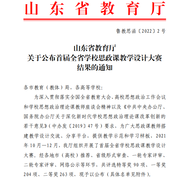 本次比赛由山东省教育厅主办,参赛对象涵盖全省学校专职思政课教师及各级思政课教研员。其目的在于深入贯彻落实全国全省教育大会、高校思想政治工作会议和学校思想政治理论课教师座谈会精神以及《中共中央办公厅国务院办公厅关于深化新时代学校思想政治理论课改革创新的若干意见》,为广大思政课教师搭建教学设计交流、分享平台,对提升思政课教师教学能力、提高教学水平发挥了重要作用。马玉彤、齐甜甜两位教师在备赛期间不计个人得失,利用假期时间积极钻研,主动加班备赛,不仅促进了教师个人专业成长,同时提升了学校外部声誉。