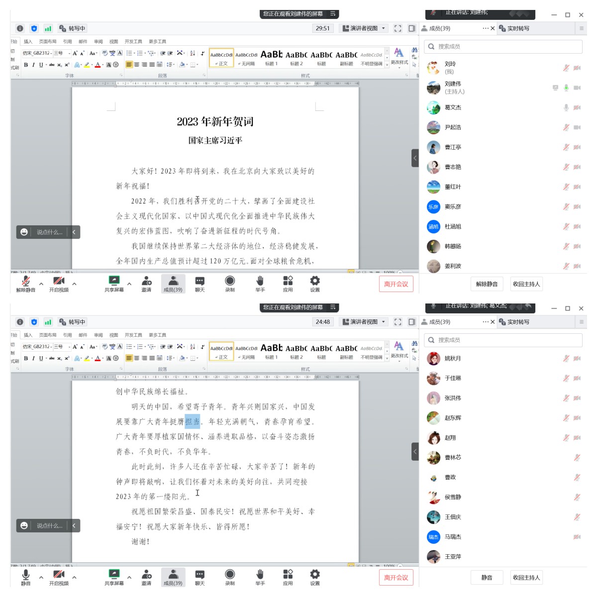 首先,与会人员集体学习了国家主席习近平2023年新年贺词。习近平主席的新年贺词,让全国人民倍感亲切和振奋。一句“每个人都不容易”,共情民生冷暖;一声“让明天的中国更美好”,激扬奋进豪情。通过学习,广大教师深刻认识到,在刚刚过去的2022年里,面对道道关隘、面临重重考验,党带领全国人民团结奋斗,铸就坚强盔甲,各项事业取得的成绩来之不易。面对新征程,任凭风云变幻、风高浪急,只要全党全国各族人民在党的旗帜下团结成“一块坚硬的钢铁”,以愚公移山的志气、滴水穿石的毅力,脚踏实地,埋头苦干,就一定能够把宏伟目标变为美好现实。