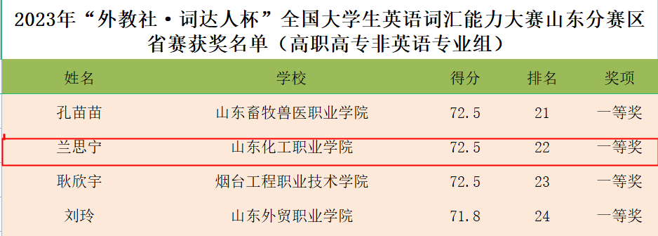 近日,由中国外语战略研究中心、中国外语教材与教法研究中心和上海外语教育出版社联合举办的2023年“外教社·词达人杯”山东省赛公布比赛结果,在高职高专非英语专业组中,我校学生学生兰思宁荣获省赛一等奖,成功晋级国赛。