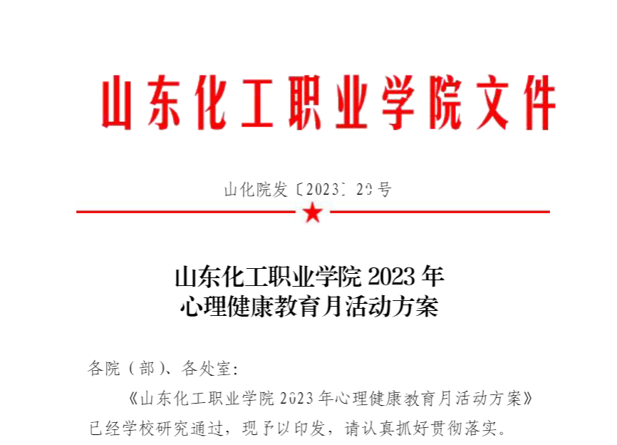 为认真贯彻落实山东省教育厅、卫生健康委员会《关于举办2023年山东省学校心理健康教育月活动的通知》精神,扎实推进学校心理健康教育提升活动,进一步加强人文关怀和心理疏导,提升学生心理健康素养,提高我校心理健康教育工作水平,2023年“山东化工职业学院心理健康教育月”活动已经顺利开展。