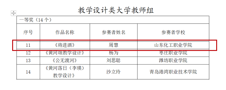 近日,山东省教育厅山东省语言文字工作委员会公布了黄河文化经典诵读课例评选大赛的比赛结果,基础教研部周蕙老师的《将进酒》、吴宁霞老师的《诗经·豳凤·七月》分别获得了教学设计类大学教师组一等奖和三等奖,孙利蕊老师的《将进酒》获得视频微课类大学教师组三等奖。
