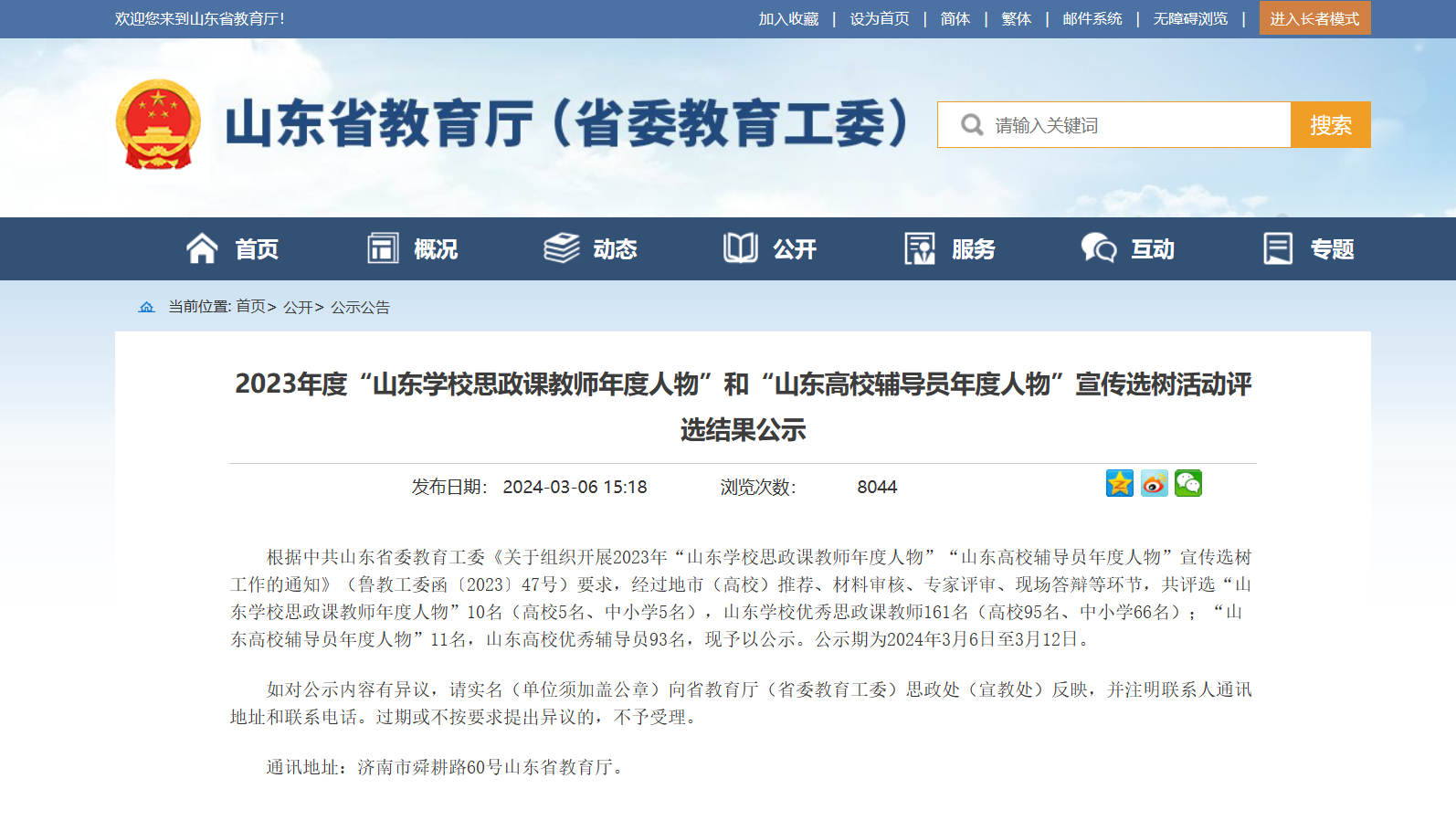 新学期伊始,从山东省教育厅(省委教育工委)传来喜讯,经过专家评审,我校马克思主义学院齐甜甜老师荣获“山东学校优秀思政课教师”称号,为我校赢得2024年首个省级个人荣誉。