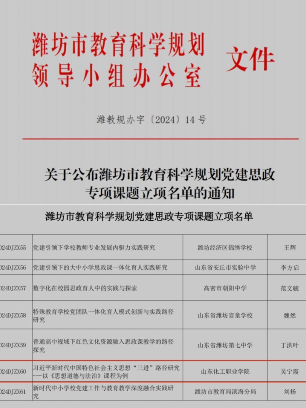近日,潍坊市教育科学规划领导小组办公室公布了潍坊市教育科学规划党建思政专项课题立项名单,我校马克思主义学院副院长吴宁霞主持的《习近平新时代中国特色社会主义思想“三进”路径研究 ——以〈思想道德与法治〉课程为例》获批立项。