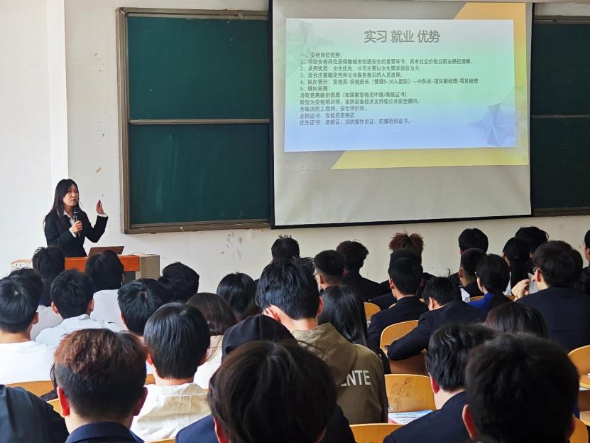 宣讲会上,青岛地铁宣讲团负责人通过视频展示、数据解读、案例分享等形式,系统介绍了企业发展历程、轨道交通行业前景及“智慧地铁”建设成果。针对学生关注的岗位需求,重点讲解了地铁安检员、站务服务人员的岗位职责、技能要求及晋升通道,强调“安全至上,服务为民”的职业理念。 据悉,实习期间学生可享受生活补贴、免费工装、职业保险等福利,转正后更有六险二金、宿舍、班车、健康体检、子女托幼费、为新婚员工提供结婚贺仪等福利待遇,为员工打造干事创业幸福成长平台。现场多次响起热烈掌声。