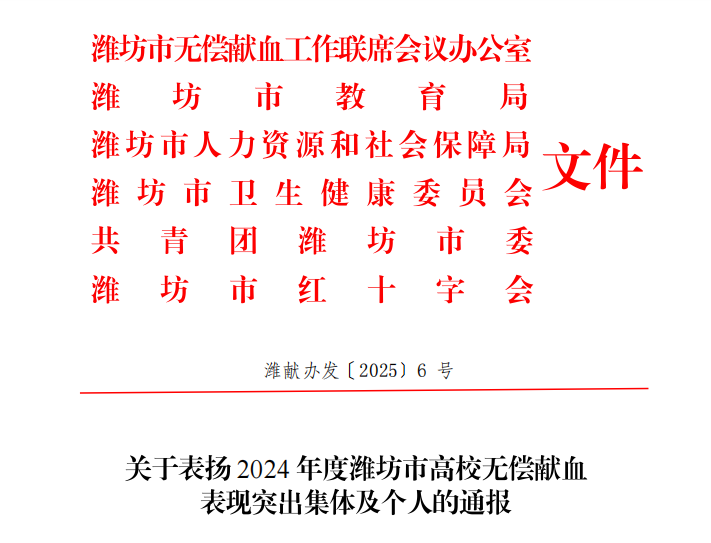 近日,潍坊市无偿献血工作联席会议办公室等6部门联合发出表扬通报,对2025年无偿献血工作表现突出的先进集体和人个进行表彰。学校评为潍坊市无偿献血组织表现突出集体,其中国凯航空学院斩获多项荣誉:学院党支部书记解素雯获评无偿献血工作表现突出个人,学生张函菲获评无偿献血志愿服务表现突出大学生,赵悦豪等30名同学获评潍坊市无偿献血爱心大学生,这份亮眼的成绩单,是国凯航空学院长期深耕无偿献血等公益工作的有力见证。