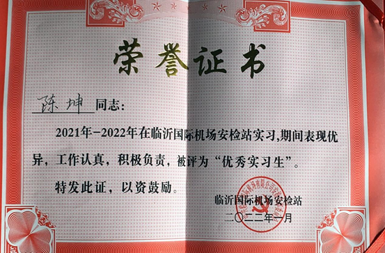 近日,国凯航空学院学子陈坤接过了临沂启阳国际机场领导亲自颁发的“优秀实习生”证书,以肯定他在实习期间付出的辛勤劳动和取得的优异成绩。