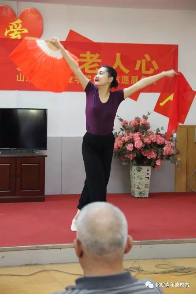 李阿姨上台表演了若干节目,感谢青年志愿者的到来