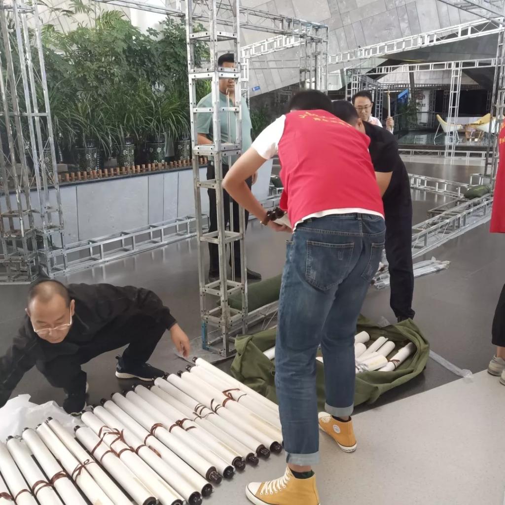 我院志愿者于9月22日前往城市艺术中心提前为书画展布置现场。搬运、整理、布置,我院志愿者用一上午时间将来自潍坊多个地区的书画作品一一布置好。