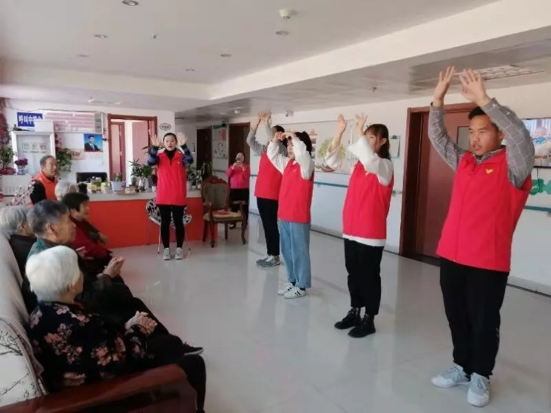 活动开始后我们为老人们唱歌,朗诵,表演手势舞等等,为他们带去了许多欢声笑语。在唱《月亮代表我的心》的时候,一位老奶奶还冲我们比心。