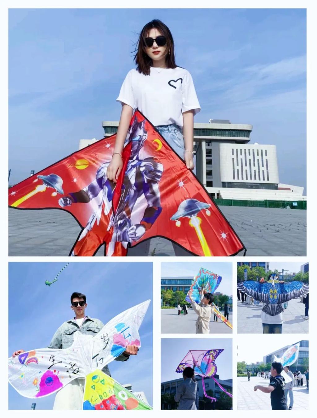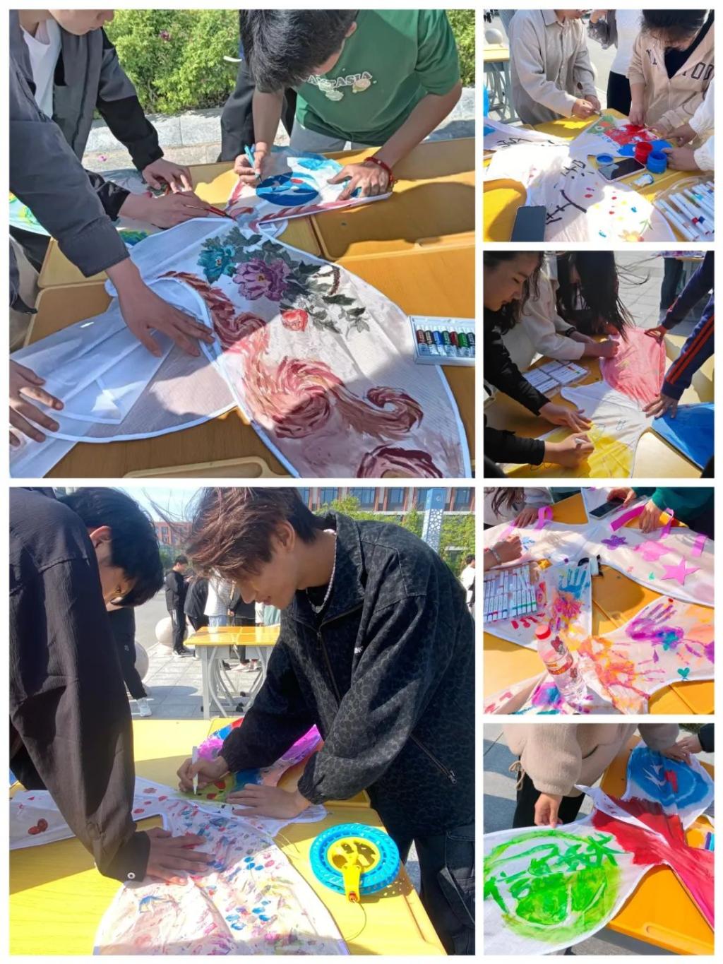 活动为同学们准备了颜料、画笔、贴纸以及空白风筝,参加者拿到材料后便开启他们的DIY风筝之旅。活动现场,同学们的风筝制作精美,造型独特,展现学生的创意和想象力,一笔一划充分体现学生们的细心和耐心。制作完成后,各色风筝争先恐后地冲向云霄,瞬间将湛蓝的天空装点得五彩斑斓。