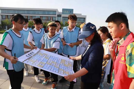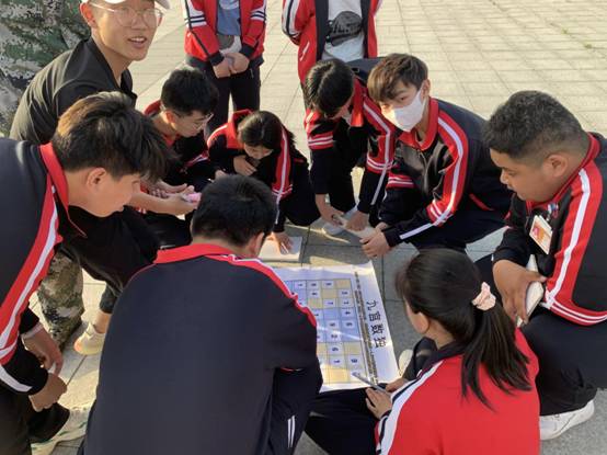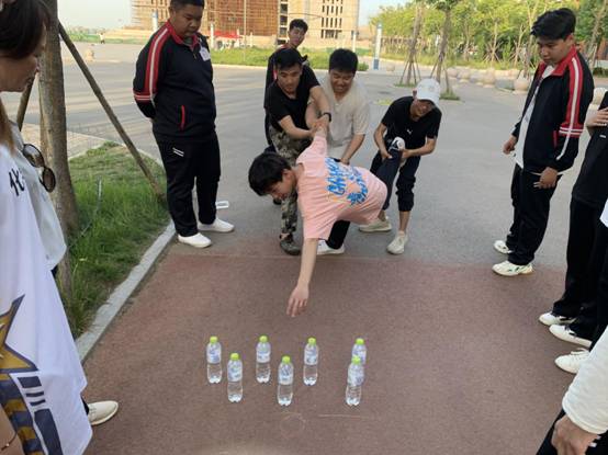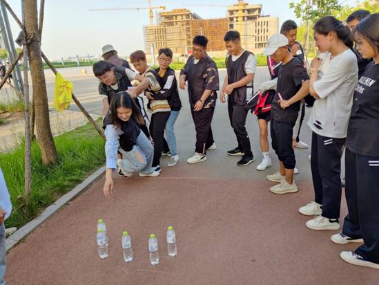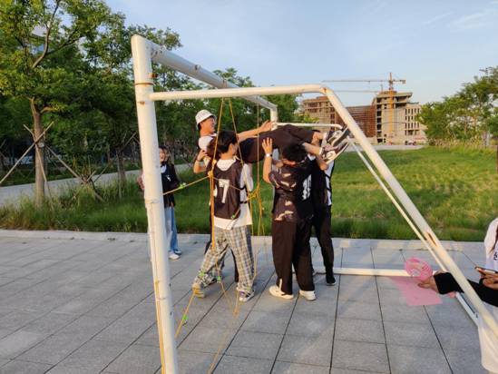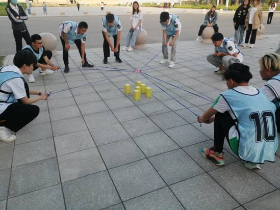 在团队合作闯关活动中,各二级学院派出1位老师和7名同学组成参赛队伍进行比赛。