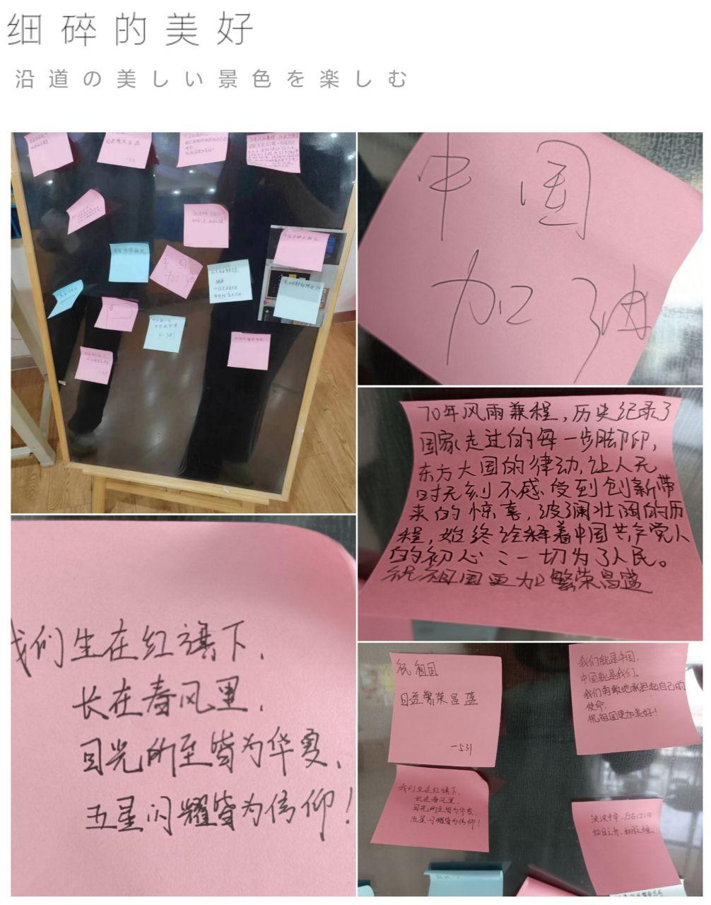 观影结束后,同学们在留言板处写下自己的感受和对祖国的美好祝福:“我们生在红旗下,长在春风里,国光所致皆为华夏,五星闪耀皆为信仰!”“70年风雨兼程,历史记录了国家走过的每一步脚印,东方大国的律动,无时无刻不感受到创新带来的惊喜,波澜壮阔的历程,始终诠释着中国共产党人的初心:一切为了人民,祝祖国更加繁荣昌盛!”“中国,加油”!